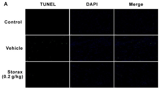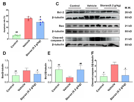The results of terminal deoxynucleotidyl-transferase-mediated dUTP nick end labeling (TUNEL) staining were shown in Figure 7A,B. Few TUNEL-positive cells were observed in the control group. Compared with the control group, the number of TUNEL-positive cells in the vehicle group increased significantly. Compared with the vehicle group, the storax 0.2 g/kg group could significantly reduce the number of TUNEL-positive cells in heart tissue. It was suggested that storax could attenuate cardiomyocyte apoptosis in ISO-induced post-infarction myocardial fibrosis. To confirm the anti-apoptotic effect of storax, mitochondrial-apoptosis-related proteins, such as Bax, Bcl-2 and cleaved Caspase-3 in myocardial tissues, were detected by Western blotting (WB). The results are shown in Figure 7C–F. Compared with the control group, Bax and cleaved Caspase-3 were significantly increased and Bcl-2 was decreased in the vehicle group. Storax significantly down-regulated expression of Bax and cleaved Caspase-3 and significantly increased expression of Bcl-2.