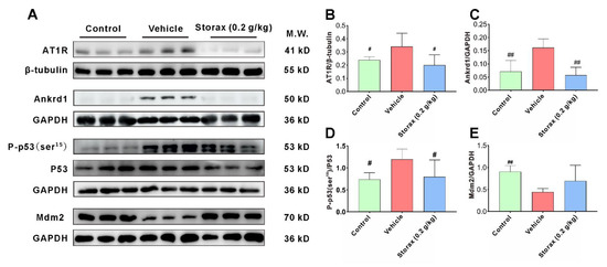 In order to illustrate the mechanism of storax against cardiomyocyte apoptosis, the expression levels of AT1R, Ankrd1, P53, P-p53 (ser15) and Mdm2 in myocardial tissue were examined by WB (Figure 8A). Compared with the control group, the expression levels of AT1R, Ankrd1 and P-p53 (ser15) in myocardial tissue of vehicle group rats were significantly increased, and the expression level of Mdm2 was significantly decreased. Storax significantly down-regulated the expression levels of AT1R, Ankrd1 and P-p53 (ser15) and increased the expression level of Mdm2.