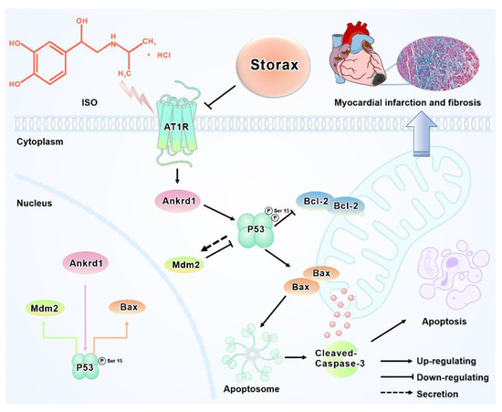 The underlying mechanisms of the cardioprotective activity of storax against ISO-induced AMI in rats. ISO-induced myocardial infarction can activate the AT1R–Ankrd1–P53 signaling pathway, thereby inducing cardiomyocyte apoptosis. Storax intervention effectively inhibited the AT1R–Ankrd1–P53 signaling pathway to suppress cardiomyocyte apoptosis and improve post-infarction myocardial fibrosis.