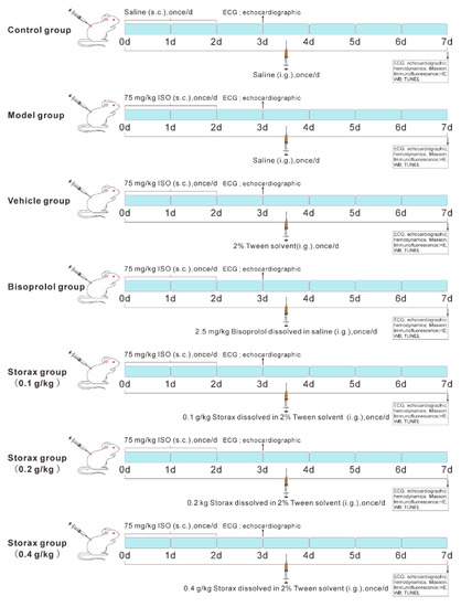 The animals were randomly divided into control group, model group, vehicle group, bisoprolol group (positive control), storax 0.1, 0.2 and 0.4 g/kg groups, a total of 7 groups. Except for the control group, the other groups were injected subcutaneously with ISO dissolved in saline to induce AMI, 75 mg·kg−1·d−1, 24 h apart, for 2 d. The storax oil was added dropwise to the 2% Tween-80 solution, emulsified by continuous grinding and diluted with physiological saline to the desired concentrations: 0.01, 0.02, 0.04 g/mL storax. The dosages of ISO and storax were chosen based on preliminary experiments and previous literature [51,52].