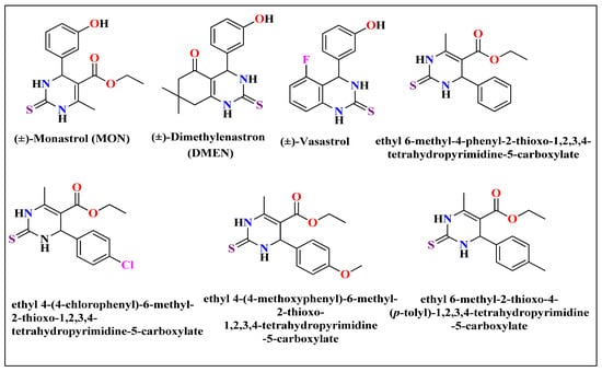 Among different heterocyclic compounds, dihydropyrimdin-2(1H)-thiones [] are heterocyclic compounds that include a pyrimidine ring system []. These compounds are often produced by variants of notable three-component [] Biginelli [] reaction. The dihydropyrimidines and Dihydropyrimidine-2-thiones [] have various biological activities, ref. [] including antiviral, antibacterial, hypotensive [], anti-inflammatory [] anti-oxidant properties [] and act as calcium channel blocker [,]. These compounds can be utilized as an evaluator of calcium channels [] and multiple reflections of drug resistance []. The ring structure of pyrimidine is present in several biomolecules such as nutrients and nucleic acids, and assumes a significant part in different biological processes []. Since the discovery of monastrol as low molecular weight anticancer agent, a radical increase in the synthesis of dihydropyrimidine derivatives has been observed, as shown in Figure 1 [,,,].
