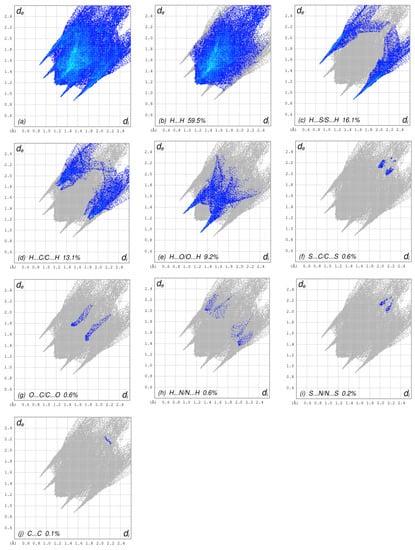 The complete 2D fingerprint plots showing compound 4 (a) all interactions, and delineated into (b) H ⋯ H, (c) H ⋯ S/S ⋯ H, (d) H ⋯ C/C ⋯ H, (e) H ⋯ O/O ⋯ H, (f) S ⋯ C/C ⋯ S, (g) O ⋯ C/C ⋯ O/, (h) H ⋯ N/N ⋯ H, (i) S ⋯ N/N ⋯ S, (j) C ⋯ C interactions.