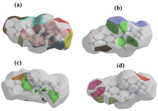 The Hirshfeld surface analysis was performed with the title compound using standard analysis protocol []. The results of HS analysis are mentioned in the Figure 4, Figure 5 and Figure 6. All other data relevant to Hirshfeld surface (HS) analysis along with significance of the study are provided in the Supplementary File (Figures S1–S7) for consultation see [,].
