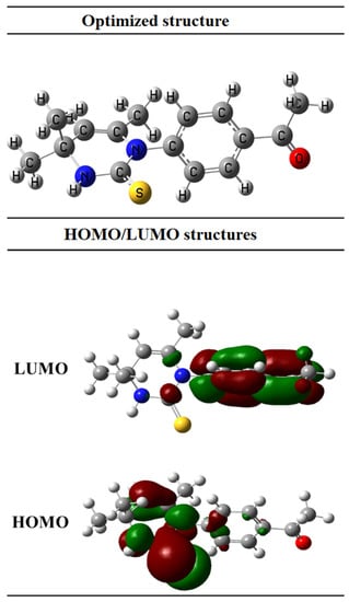 The ground state geometry of the selected compounds was optimized using density functional theory calculations, which is a reliable computational approach. DFT calculations [] were used to optimize the ground state geometries, with B3LYP as functional correlation and 6-31G* as a basis set [,]. It is important to determine the electronic properties of the compound as chemical reactivity and stability of compound depend on electron density, DFT is a theoretical approach which provide precise assumptions on the electronic behaviour of the compound [,]. The initial structures were completely optimized using Guassian 09W software []. The energy minimization was done by omitting the imaginary frequencies in a harmonic vibrational analysis []. Visualization was carried out using Guass view 6.0 [].