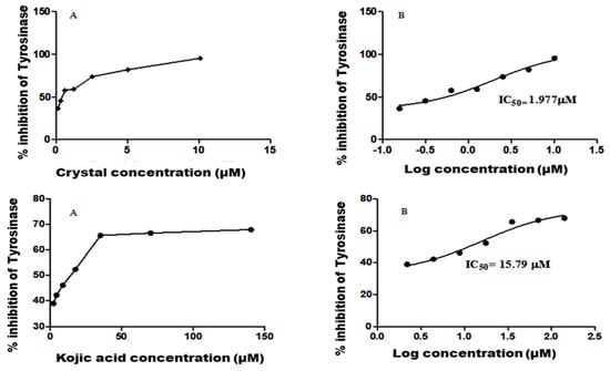 IC50 values of crystal and reference drug kojic acid were calculated by nonlinear regression using Graphpad prism 5.0. (A) Represent the inhibitor concentration versus enzyme activity. (B) Represent the Log concentration versus enzyme activity.