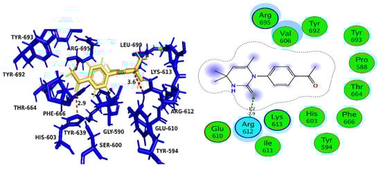 R1 subunit of RNR protein contains important amino acid residues, which are involved in activation of protein. The amino acid residues of active site were selected after extensive literature review. The site finder utility of MOE was used to select important residues of active site, which were selected were as follows: ARG695, LYS613, ARG695, TYR693, LEU699, GLY590, HIS603, SER600, PHE666, GLU610, ARG612 PRO588, TYR692 and TYR594. These amino acid residues were selected and docked with compound 4. The most stable conformation based on docking score was selected and analysed for further analysis. Figure 11 shows most probable binding interactions of compound 4 with in activation loop of RNR.