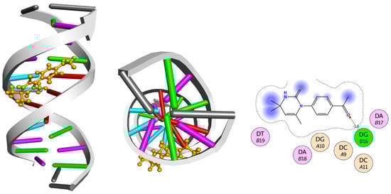 Docked conformation of compound 4 indicating DNA groove binding mode and 2D conformation.