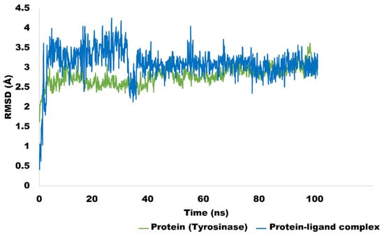Evolution of RMSD pattern of enzyme tyrosinase (green-coloured trajectory) and protein–ligand complex (blue-coloured trajectory).