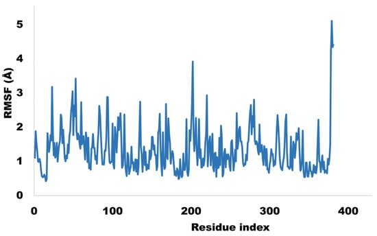 The nature of molecular interactions identified by the molecular docking method was further investigated using molecular dynamic simulation studies. MD simulations are a potential method for studying the stability of protein–ligand complexes. To measure the stability of a protein–ligand complex, various analytic matrices such as RMSD and RMSF are used. The root mean square deviation (RMSD) is a measure of the average displacement of atoms and molecules with respect to a reference frame. The average RMSD of protein tyrosinase was 2.7 angstrom and the complex average was found 3.3 angstrom, which is an acceptable value. The in-vitro and in-silico inhibitory potential of compound 4 against mushroom tyrosinase enzyme was studied in the current investigation. Both investigations show considerable inhibition of the tyrosinase enzyme, which is validated by MD simulation studies. Figure 13 and Figure 14 depicted the RMSD and RMSF patterns of a protein (mushroom tyrosinase) and a protein–ligand complex, respectively.