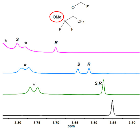 It can be observed that AcSiCD6 does not differentiate at all the two enantiomers and causes only a small shift (3.57 ppm) at higher frequencies of the observed proton resonance. In the mixture containing the β-derivative AcSiCD7, the resonances of the two enantiomers are instead well differentiated and shifted at 3.64 ppm (δS) and 3.61 ppm (δR). Finally, with AcSiCD8, a remarkable increase in the non-equivalence is observed (0.101 ppm, Table 1) for the methoxy groups of the two enantiomers, which are also significantly shifted at higher frequencies (δS = 3.80 ppm, δR = 3.70 ppm). This trend highlights a better enantiodifferentiation efficiency of the larger CD as chiral selector for the fluorinated substrate.