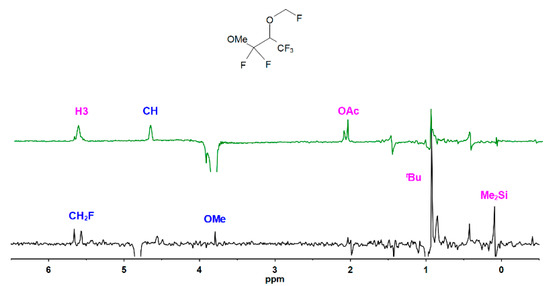 Cyclodextrin derivatives endowed with silyl/alkanoyl or alkyl/alkanoyl derivatizing groups represent popular chiral auxiliaries for gas chromatographic applications in the area of the enantiodiscrimination of chiral substrates lacking in hydrogen bond donor groups, which constitute challenging systems for the majority of the enantioseparation methods [19,20,21]. As an example, the gas chromatographic separation of the two enantiomers of 1,1,1,3,3-pentafluoro-2-(fluoromethoxy)-3-methoxypropane (compound B), a chiral degradation product of the fluorinated anesthetic sevoflurane [22], was achieved with high efficiency by selecting heptakis(2,3-di-O-acetyl-6-O-tert-butyldimethylsilyl)-β-cyclodextrin (AcSiCD7) as the chiral agent [23]. Further NMR studies indicated that the guest is not deeply included into the CD cavity, but rather the enantiodiscrimination is driven by Si-F interactions [24]. Analogously, heptakis(3-O-butanoyl-2,6-di-O-n-pentyl)-β-cyclodextrin has been tested with this substrate, showing only moderate efficiency in its gas chromatographic enantiodiscrimination [25]. On the contrary, its γ-analog (Lipodex E), largely applied as chiral selector in chromatographic separations [26], proved to be remarkably efficient in differentiating the two enantiomers of compound B [25]. Interestingly, in this last case, subsequent NMR investigations pointed out a prominent role of the inclusion phenomenon in the chiral differentiation [27].
