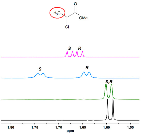 The three cyclodextrins were then tested with the second chiral substrate, MCP. Data show that, analogously to what was observed for compound B, AcSiCD6 does not generate enantiodiscrimination of the methyl protons of the two enantiomers (Figure 3 and Table 2). The 7- and 8-membered ring derivatives are able to differentiate the two enantiomers also in this case; however, interestingly, AcSiCD7 proved to be the best chiral selector for MCP in terms of enantioseparation. A significant non-equivalence was measured for the protons of the substrate, in particular for the methine one (0.218 ppm, Table S2), in the presence of this chiral selector.