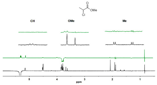 In view of the above considerations, to ascertain the role of size cavity in the enantiodiscriminating efficiency, the three silylated-acetylated cyclodextrins (AcSiCD6, AcSiCD7, and AcSiCD8, Scheme 1) have been compared in the enantioselective interaction with compound B and methyl 2-chloropropionate (MCP, Scheme 1) via solution NMR spectroscopy in deuterated cyclohexane (C6D12), to better mimic the gas chromatographic environment. Compound B is endowed with fluorinated moieties able to interact with cyclodextrin silicon atoms at their external surface. MCP, frequently employed as probe in the analysis of the gas chromatographic behavior of cyclodextrin derivatives [30,31,32], is devoid of such functionalities.