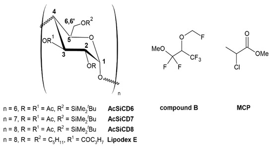 Hexakis(2,3-di-O-acetyl-6-O-tert-butyldimethylsilyl)-α-cyclodextrin (AcSiCD6), heptakis(2,3-di-O-acetyl-6-O-tert-butyldimethylsilyl)-β-cyclodextrin (AcSiCD7), octakis(2,3-di-O-acetyl-6-O-tert-butyldimethylsilyl)-γ-cyclodextrin (AcSiCD8), and 1,1,1,3,3-pentafluoro-2-(fluoromethoxy)-3-methoxypropane (compound B) were kindly provided by Professor V. Schurig; methyl 2-chloropropionate (MCP) was purchased from Merck (Darmstadt, Germany); C6D12 was purchased from Deutero GmbH (Kastellaun, Germany). All chemicals were used without further purification.