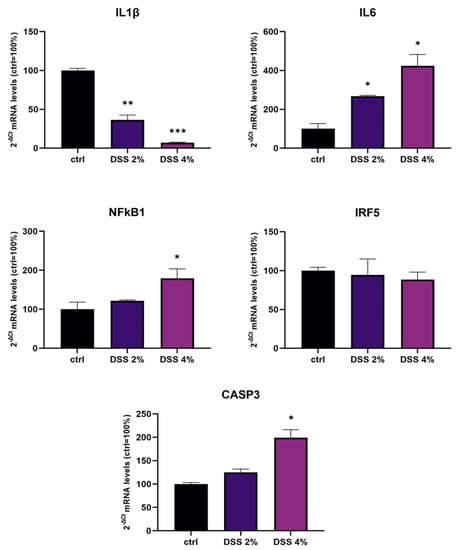mRNA expression analysis of inflammation and apoptosis-related genes in differentiated Caco-2 monolayers after DSS treatments. mRNA expression analysis by qPCR on total RNA extracted from Caco-2 cell monolayers treated with DSS 2% and 4% for 48 h. Amounts of target IL-1β, IL-6, NF-kB1, IRF5, and CASP3 mRNAs are expressed as 2−ΔCt mean values obtained from 2 rounds of real-time PCR assays for each of 3 independent biological replicates (see Materials and Methods for details) and normalized with respect to the GAPDH gene (housekeeping), then expressed as percent with respect to the untreated control (ctrl = 100%). Statistical analysis by one-way ANOVA with Dunnett correction for multiple comparisons (* p < 0.05; ** p < 0.01; *** p < 0.001).