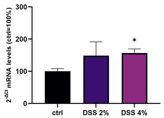 Levels of SLC15A4/PHT1 mRNA were evaluated in mature Caco-2 monolayers challenged with 2% or 4% DSS (Figure 2). qPCR analysis revealed that mRNA levels showed an overall DSS dose-dependent up-regulation trend compared to untreated cells (ctrl = 100%), which became statistically significant following DSS 4% (156.6% ± 13.0; p < 0.05).