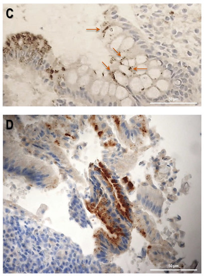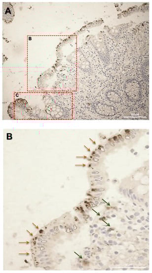 Firstly, the biopsy specimens of UC patients were reviewed for evidence of microscopic features of the UC disease. Figure 5 shows evidence from UC patients which are representative of a group of n = 20. In UC patients, epithelium showed mucosal distortion with surface irregularity and alterations in crypt size, spacing, orientation (i.e., loss of parallelism), and shape. The increased distance and the separation of the crypts from the underlying Muscolaris mucosae have been also detected. Moreover, a reduction in the number of Goblet cells can be observed, which appear hyperplastic. Histological studies revealed that, in patients with active UC, SLC15A4/PHT1 immunoreactivity was strongly and specifically localized in the absorptive epithelium (Figure 5A) and distributed in small intracellular vesicles near the brush border of the enterocytes (Figure 5B). Sporadic immunoreactive patches can be observed in immune cells of the lamina propria (Figure 5A,B) and in Goblet cells (Figure 5C).