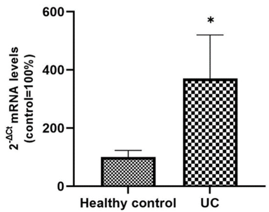 From the corresponding histological sections of active UC patients and healthy controls included in the study, total RNA was extracted in order to analyze the expression levels of SLC15A4/PHT1 mRNA. qPCR analysis revealed that the expression levels of the gene are significantly upregulated in UC patients compared to control patients (370% ± 150 vs. 100% ± 23; p < 0.05; see Figure 7).