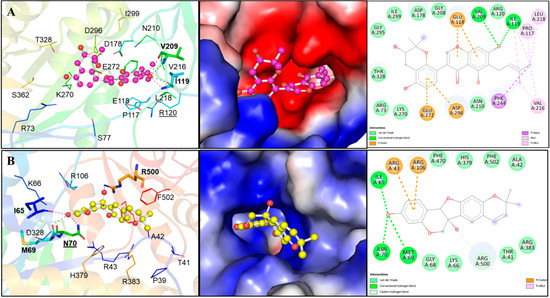 - Mohammad, T.; Siddiqui, S.; Shamsi, A.; Alajmi, M.F.; Hussain, A.; Islam, A.; Ahmad, F.; Hassan, M.I. Virtual screening approach to identify high-affinity inhibitors of serum and glucocorticoid-regulated kinase 1 among bioactive natural products: Combined molecular docking and simulation studies. Molecules 2020, 25, 823. [Google Scholar] [CrossRef]