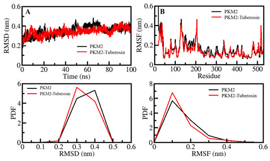 The structural movements in a protein are essential for its functional activity inside the living system [30]. The analysis of RMSD has been convenient for examining the structure deviation in proteins and protein-ligand complexes [31,32]. The structural deviations of the PKM2 and PKM2-Tuberosin complexes were examined within the solvent environment to check their stability and movements during the simulation. The RMSD values of the backbone of PKM2 and its docked complex with Tuberosin were recorded to examine their structural deviations, which remained stable during the entire simulation (Figure 2A, upper panel). The average values of RMSD for PKM2 and PKM2-Tuberosin complex were 0.35 nm and 0.34 nm with a maximum of 0.48 nm and 0.45 nm at 65 ns and 90 ns, respectively. A random but negligible fluctuation in the RMSD pattern was seen 30 ns in the case of both systems of PKM2, possibly due to their initial adjustment. Overall, the distribution of the RMSD pattern did not show any substantial shifts, which suggested the stability of PKM2 with a palpable strength of ligand binding during the simulation. The distribution of RMSD values as a probability distribution function (PDF) also suggested no significant change in the PKM2 dynamics after the Tuberosin binding (Figure 2A, lower panel).