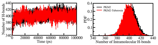 H-bonds play a vital role in the stability and integrity of protein structures [39]. Examining the time evolution of formation and breakdown of H-bonds during the simulation time is useful for assessing the structural integrity and stability of proteins and protein-ligand complexes [40]. The time evolution of H-bonds was calculated and plotted to examine the consistency of intramolecular bonds within PKM2. The average number of H-bonds formed intramolecularly within PKM2 before and after Tuberosin binding were 402 and 399, respectively (Figure 4, left panel). The results suggested no significant change in the number of H-Bonds within PKM2 when complexed with Tuberosin. A negligible fall in the number of H-bonds can be correlated with the occupancy of intramolecular space in PKM2 by Tuberosin. The calculated PDF suggested a fair constancy in intramolecular H-bonds in PKM2 before and after Tuberosin (Figure 4, right panel).