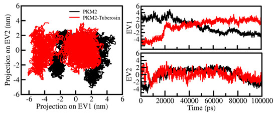 Conformational projections of PKM2 in PCA. 2D projections of conformational sampling of PKM2 and PKM2-Tuberosin (left panel). The time evolution of projections of trajectories on both EVs (right panel).
