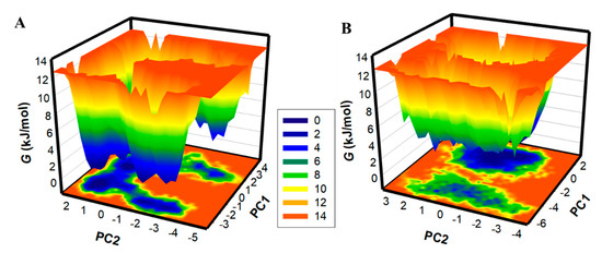 3.7. Principal Component Analysis and Free Energy Landscapes