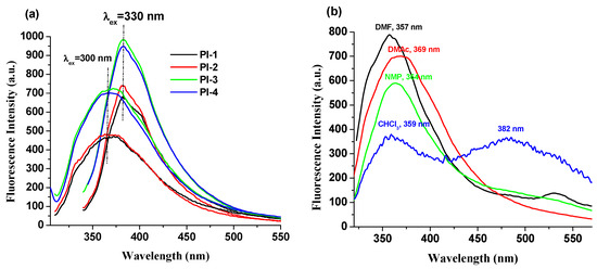 The fluorescence properties of the PI(1–4) in DMF, NMP, CHCl3 and DMAc solvents and in solid state (thin films) were explored. These compounds exhibit an emission band (Table 1) that is influenced by the values of the excitation wavelengths. For example, PI-1 displayed emission at 373 nm (λex = 300 nm) and 382 nm (λex = 330 nm) in DMAc solution, respectively (Figure 3a). No significant and clear relationship is observed between the electronic effects of the substituents (-O-C6H5-C(CH3)2-C6H5-O- (for PI-1), -O- (for PI-2), -C(CH3)2- (for PI-3), and -O-C6H5-C(CF3)2-C6H5-O- (for PI-4)) and the luminescence band shifts (Figure 3b). This behavior indicates that these substituents seem to slightly influence the emission of PI(1–4) samples, which may be due to the long distance between the substituent groups and DOPO units.