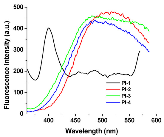 As shown in Figure 5, the film state emits a strong red-shifted fluorescence (with λem at above 510 nm, except for PI-1) quite different from that in solutions (Table 1) where the polymer chains underwent an expansion.