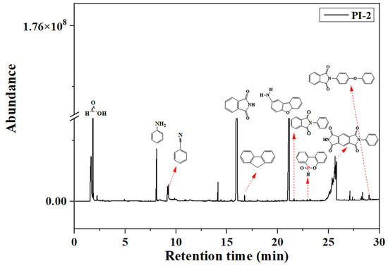 Pyrolysis, followed by GC-MS analysis, was performed in order to determine the decomposition mechanisms of the PI(1–4) based on the products resulting from thermal scission of chemical bonds. Figure 6 exhibits the total ion chromatogram of the pyrolysis products of the PI-2 sample, as an example in the series. In accordance with the increasing retention times (RT, min.) it can be observed that the main pyrolysis products of PI-2, are (Figure 6): formic acid (1.814 min.), benzene (2.797 min.), toluene (4.216 min.), aniline (8.037 min.), benzonitrile (8.130 min.), naphthalene (11.350 min.), dibenzofuran (15.470 min.), phthalimide (16.300 min.), fluorine (16.840 min.), p-hydroxybiphenyl (18.140 min.), and phenanthrene (19.10 min.). Other pyrolysis products revealed in the chromatogram are 4a,5a,9a,9b-tetrahydrodibenzo[b,d]furan-2-amine (RT = 20.74), 2-phenylisoindoline-1,3-dione/1H-isoindole-1,3(2H)-dione 2-phenyl (RT = 21.59), 9,10-dihydro-9-oxa-10-phosphaphenanthrene-10-oxide (RT = 22.91), 2-phenylpyrrolo [3,4-f]isoindole-1,3,5,7(2H,6H)-tetraone (RT = 26.75), and 2-(4-phenoxyphenyl) isoindoline-1,3-dione (RT = 29.00) [30,31,32,33].