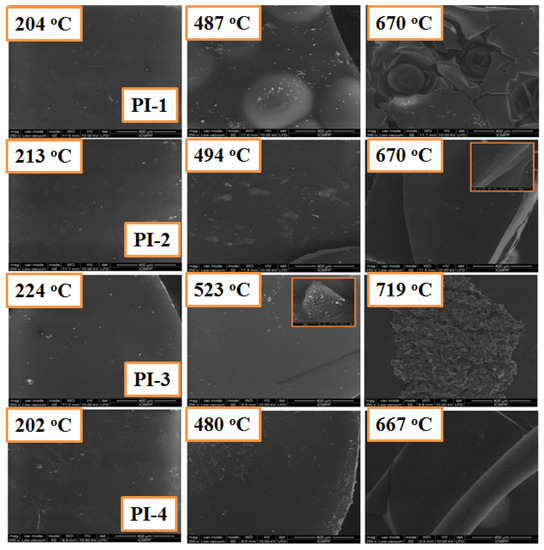 The SEM images of the carbonaceous residues for PI(1–4) polymers obtained after heating the samples at different temperatures are shown in Figure 8. It can be seen that the surface of the char residue exhibits a dense structure without cracks or pores at the end of the first degradation stage. When the degradation is finished, the char residue still shows a continuous and dense structure, but the residue obtained for PI-2 and PI-4 has a much more compact structure compared to the PI-1 and PI-3 polymer residues, respectively, which indicates that the aliphatic sequences of PI-1 polymers are eliminated during the first stage of thermal decomposition, penetrating through the resulting carbonaceous residue and leading to a solid coal with a less compact structure. This behavior was also seen for the PI-3 polyimide.