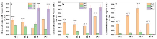 Figure 10. Elemental N/C, P/C and F/C ratios (according to EDX analysis) of PI(1–4) at different degradation stages under nitrogen atmosphere obtained from TGA experiments (a) at 204(PI-1)/213 (PI-2)/224 (PI-3)/202 (PI-4) °C, (b) at 487 (PI-1)/670 (PI-2)/523 (PI-3)/480 (PI-4) °C and (c) at 670 (PI-1)/690 (PI-2)/719 (PI-3)/667 (PI-4) °C.