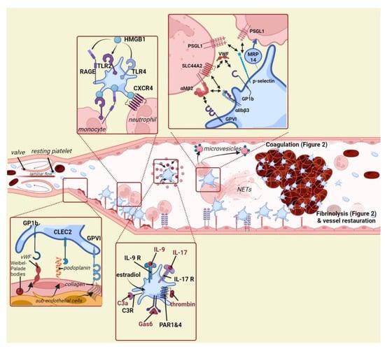 Upon activation, platelets undergo a phenotypical change associated with a significant change in expression and secretion pattern []. In the context of coagulation and venous thrombosis, several components that modulate platelet activation have been identified. Toll-like receptors (TLRs) are expressed by various immune cells [,,]. These receptors recognize Damage-Associated Molecular Patterns (DAMPs) or Pathogen-Associated Molecular Patterns (PAMPs), resulting in cells that become activated, generate oxygen and nitrogen radicals, and/or produce cytokines (Figure 1) []. Platelets also express TLRs at both their membrane and intracellular, and platelets are activated in response to DAMPs or PAMPs after which they mediate an immune response [,]. In mouse venous thrombosis, HMGB1 can function as a DAMP and is both secreted and recognized by platelets, presumably via TLR2, TLR4, and/or RAGE []. HMGB1 deficient mice or wild type mice treated with an HMGB1 inhibitor presented decreased thrombus formation, possibly because of reduced monocyte recruitment and signs of NETosis in the thrombus. In addition, supplementing mice with recombinant HMGB1 enhanced thrombus formation while platelet-specific HMGB1−/− mice were protected from thrombosis, coinciding with a decrease in the number of neutrophils present in the formed thrombi []. Kindlin-3, an integrin activator expressed in platelets, and paxillin appeared crucial for αIIbβ3 inside-out signaling [,,]. In mice, disruption of the interaction between kindlin-3 and paxillin or a selected deficiency for platelet-Kindlin-3 demonstrated a significant decrease in experimental DVT.