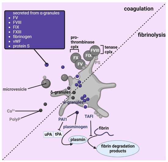Thrombus resolution starts with the process of breaking down crosslinked fibrin strands in a process called fibrinolysis. Defective fibrinolysis can lead to several chronic and acute pathologies, mostly linked to haematological disorders []. The main fibrinolysin is plasmin, a protease resulting from the cleavage of inactive circulating plasminogen. Comparable to coagulation, fibrinolysis is tightly controlled with several specific proteases, cofactors and protease inhibitors that all have a part to play in ensuring correct thrombus fibrinolysis. Platelets provide the PS-positive surface to allow efficient fibrinolysis (Figure 2). In addition, several reports show that platelets store and secrete both fibrinolytics, such as plasminogen [,] and antifibrinolytic agents including the plasminogen activator inhibitor-1 [] and thrombin activatable fibrinolysis inhibitor []. Secretion of these factors make platelets key mediators of fibrinolysis.
