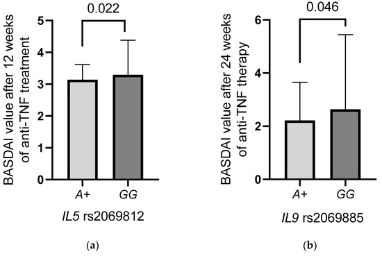 Additionally, heterozygous patients, with the IL5 rs2069812 GA genotype (GA vs. AA + GG p = 0.033) and with the IL9 rs2069885 GA genotype (p = 0.042) were characterised by lower BASDAI values than those carrying other genotypes, after 12 and 24 weeks of anti-TNF therapy, respectively. These results showed the various impact of selected SNPs on the treatment outcome with a rather earlier effect (at the 12th week) of the IL5 rs2069812 variants than that of the IL9 rs2069885 SNP observed after 24 weeks of the treatment.