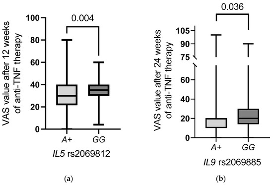 Some significant associations were also found for the heterozygous genotypes. The IL5 rs2069812 heterozygosity was more frequent in patients with lower CRP values after 12 (GA vs. GG + AA p = 0.042) and 24 (GA vs. GG + AA p = 0.012) weeks of therapy. Similarly, patients carrying the IL5 rs2069812 GA genotype had lower VAS values after 12 weeks of treatment (GA vs. GG + AA p = 0.002). As for the IL9 rs2069885 GA genotype, a greater decrease in CRP levels after 12 weeks (GA vs. GG + AA p = 0.035) and lower VAS value after 24 weeks of therapy (GA vs. GG + AA p = 0.018) were observed.