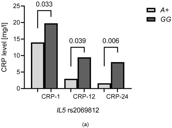 Similar relationships for the IL5 rs2069812 A allele were also observed with regard to CRP levels at different time points of treatment: at the beginning (p = 0.033), after 12 weeks (p = 0.039), and after 24 weeks (p = 0.006) of therapy with TNF inhibitors (Figure 3a). AS patients possessing IL5 rs2069812 A allele displayed decreased CRP levels compared to patients bearing other genotypes.