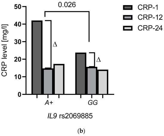 Relationships between the IL5 rs2069812 (a) and IL9 rs2069885 (b) and the CRP values in AS patients during anti-TNF treatment. A+—A allele carriers (AG/AA genotypes); GG—carriers of GG genotypes; CRP-1—at the baseline; CRP-12—after 12 weeks of anti-TNF therapy; CRP-24—after 24 weeks of anti-TNF therapy; Δ—changes in CRP levels after 12 weeks of anti-TNF therapy compared to baseline.