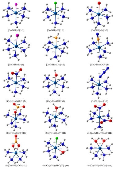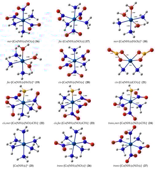 The geometry optimization of the nitrogen-coordinated complexes of cobalt 1–27 was performed at the DFT-PBE0/ATZP level using the GAUSSIAN 09 code []. As was shown earlier [], the contribution of relativistic geometry to the resulting 15N NMR shielding constants was insignificant and could safely be ignored. Therefore, in the present study, the optimization of the geometric parameters of the studied complexes was carried out at the non-relativistic level of theory. The corresponding Cartesian coordinates of all studied compounds are given in the Supplementary Materials.