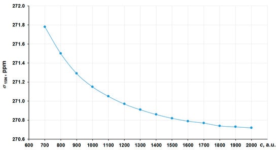To calculate the correct nonrelativistic values of σ (which are needed for the evaluation of Δrelσ), we have studied the convergence of the cobalt σ value in the hexacyanocobaltate (III) anion [Co(CN)6]3− with the increasing of the speed of light, in the same way as was done for the nitrogen SC. The corresponding graph is presented in Figure 6.