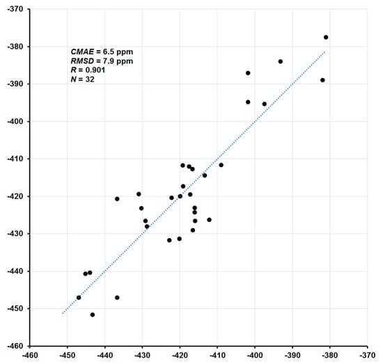 The total values of nitrogen chemical shifts δtot in Table 1 were calculated using the linear regression analysis [,,]. The strategy of this approach consists of the mapping of the observed chemical shifts onto the predicted shielding constants, in which the relationship is simulated by the linear model: