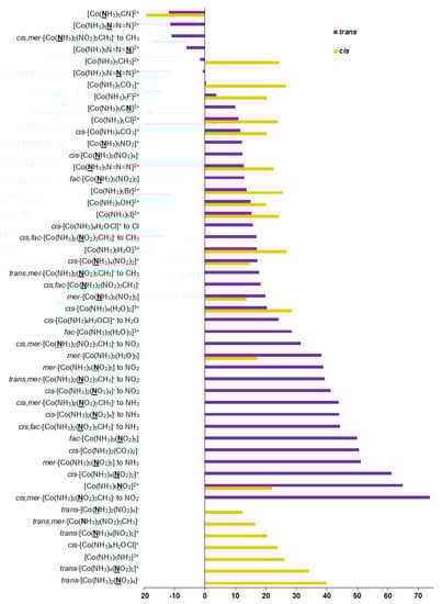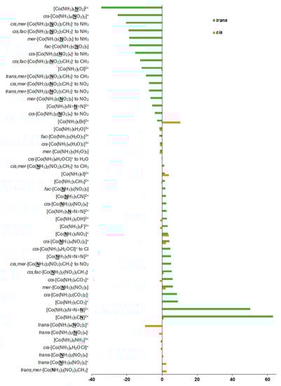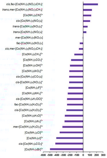 As can be seen in Table 1, the relativistic corrections to nitrogen shielding constants can be substantial, varying from −19 ppm in [Co(NH3)5CN]2+ (cis-orientation) to 74 ppm in cis,mer-[Co(NH3)2(NO2)3CH3]− (trans-orientation to NO2), see Figure 4. In an absolute value, the relativistic corrections to the nitrogen SCs can reach up to 37% of the relativistic SCs. Apparently, large relativistic corrections to nitrogen shielding constants are due to the well-known SO-HALA effect [] on nitrogen shieldings initiated by the neighboring cobalt atom.