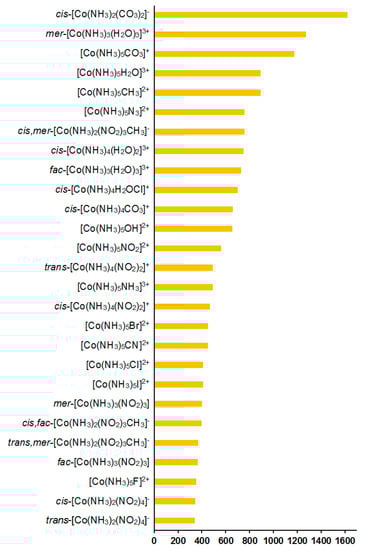 Nitrogen and cobalt NMR spectroscopy makes up an efficient tool for the structural elucidation of cobalt ammine complexes. Chemical shifts of both NMR-active nitrogen isotopes, 14N (S = 1) and 15N (S = 1/2), span over the range of about 900 ppm []. The 59Co isotope has 100% natural abundance and its chemical shift range is extremely wide, being about 20,000 ppm [], which is the largest among the known NMR scales. In this regard, accurate theoretical predictions of the NMR chemical shifts provide a powerful tool for the structural elucidation of organic and bioorganic molecules, transition metal complexes, and related species [,,,,]. In this respect, NMR chemical shifts, nitrogen and cobalt in particular, represent an undoubted challenge [,,,,]. Moreover, cobalt complexes are computationally demanding on their own, as they possess intricate electronic structures characterized, in particular, by the energetically low-lying transitions [], which assume an important role in electron correlation effects.