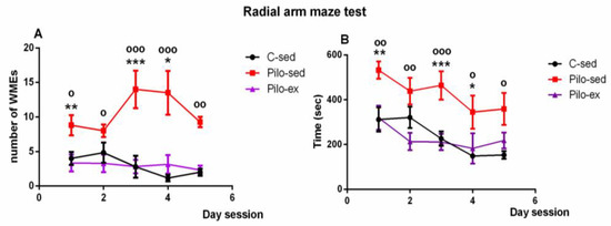 Effect of endurance training, applied before and after SE, on (A) the number of working memory errors; * p = 0.047, ** p = 0.007, *** p = 0.001 in comparison with the C-sed group; o p < 0.05, oo p = 0.002, ooo p < 0.001 in comparison with the Pilo-sed group, and (B) on the time (s) necessary to fulfill the task in the radial arm maze test in a pilocarpine-induced model of temporal lobe epilepsy. * p < 0.05, ** p < 0.01, *** p < 0.001 in comparison with the C-sed group; o p < 0.05, oo p < 0.01, ooo p < 0.001 in comparison with the Pilo-sed group.