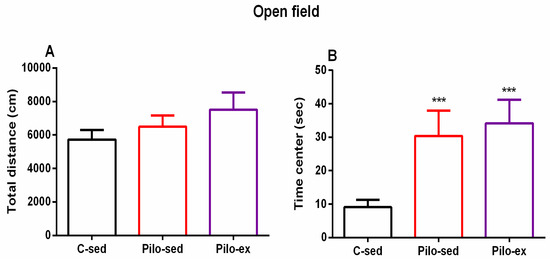 No significant difference between the three groups was observed concerning the locomotor activity in the novel field (p > 0.05) (Figure 5A). ANOVA revealed a main effect of exercise [F(2, 23) = 11.16, p < 0.001] on the time spent in the aversive central zone of the open field. The post hoc test showed that both groups Pilo-sed and Pilo-ex had lower anxiety levels compared to the C-sed group (p < 0.001) (Figure 5B).