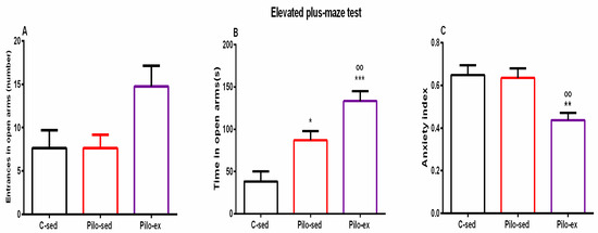 Effect of endurance training, applied before and after SE, on (A) number of entrances in open arms, (B) time (s) in open arms, * p = 0.017, *** p = 0.001, respectively, in comparison with the C-sed group, oo p = 0.024, in comparison with the Pilo-sed group, (C) ** p = 0.005 in comparison with the C-sed group, oo p = 0.009 in comparison with the Pilo-sed group.