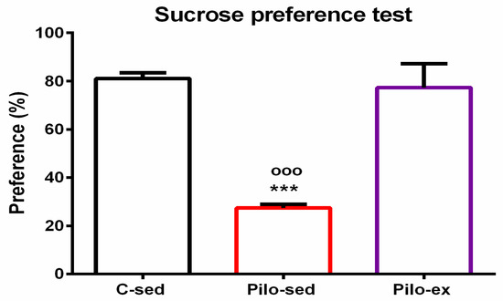 For the sucrose preference test, analysis of variance showed a significant main effect of exercise [F(2, 23) = 25.638, p < 0.001]. The post hoc test showed that the Pilo-sed animals had anhedonia in comparison with the C-sed and Pilo-ex groups (p < 0.001, respectively) (Figure 7).
