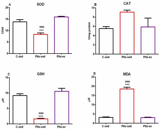 ANOVA demonstrated a significant main effect of exercise [F(2, 19) = 263.588, p < 0.001] on malondialdehyde (MDA). The Pilo-sed animals significantly increased the levels of MDA in comparison with the C-sed and the Pilo-ex groups (p < 0.001, respectively) (Figure 8D).