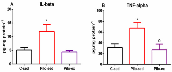 Effect of endurance training, applied before and after SE, on (A) pro-inflammatory cytokines IL-1β levels, * p = 0.024 in comparison with the C-sed group, and (B) TNF-α, * p = 0.024 in comparison with the C-sed group and o p = 0.0334 in comparison with the Pilo-sed group, respectively, in the hippocampus.