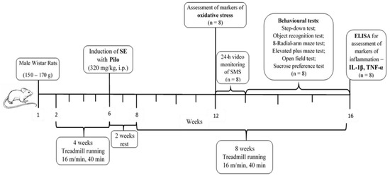 Previous reports used a protocol with exercise treatment to mitigate SE, mainly before or after its onset [22]. In the present study, we applied endurance training, for the first time, both before and after the Pilo-induced SE. This alternative approach was used to alleviate epileptogenesis and to suppress the development of a chronic state, or its consequences on the frequency of spontaneous motor seizures (SMS) and behavioral impairments in a rat model of post-SE-induced TLE. In addition, the levels of the pro-inflammatory cytokines tumor necrosis factor-α (TNF-α) and interleukin-1β (IL-1β), as well as oxidative stress markers, in the hippocampus were measured.